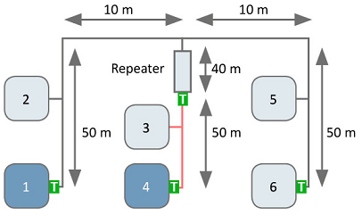 2つのノード間のシグナリングのうちもっとも遠いものは140mになります(Node 1 − Node 6間 、Node 6 − Node 9間)。