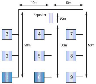 リピーターによって接続したラインは電気的に独立したセグメントで、信号に関しては最適に終端することができます。このため、ネットワークトポロジーは、電気的に影響がないピュアラインを構築します。