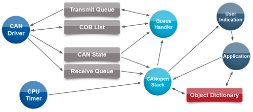 関数APIの他に、複数のタスク、スレッドで簡単に使用できるメールボックスAPIもあります。アプリケーションモジュールとCANopenスタック間のメッセージは、関数呼び出しではなくメールボックス経由で送信されます。これにより、非ブロッキング通信が確保されます。ひとつのアプリケーションをCANopenスタックを並行して使用する複数のタスクで構成することもできます。
