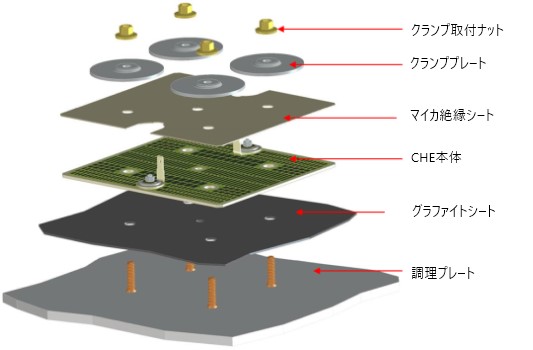 熱は、グラファイトシートを通し、加熱対象のプレートへ伝達。