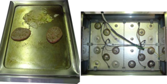 角型の形状により、複数枚並べることで、大型の鉄板焼きプレートの加熱が可能となり、繊細且つ高速での温度制御を実現します。
