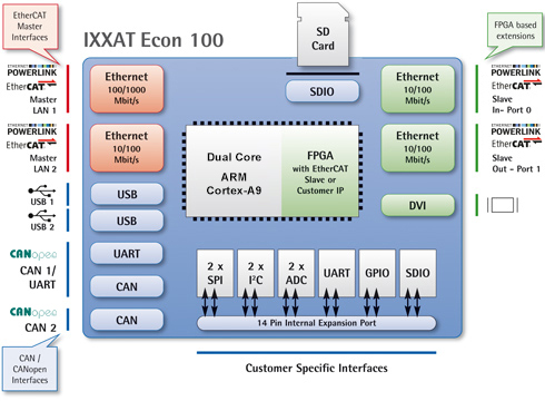 | オプション外部インターフェイス | 2×100/10MビットLAN(FPGAデザイン経由) -1×RS232インターフェイス(1×CANとトレードオフ) -DVI(特別仕様バージョン) -ディジタル入出力(オプション拡張ボード:特別仕様バージョン) -アナログ入出力(オプション拡張ボード:特別仕様バージョン) -ドライブ制御用NVRAM(オプション拡張ボード) |