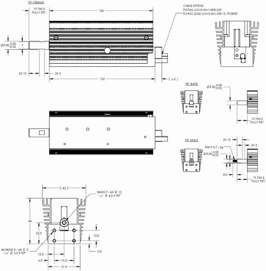 | ケーブル/端子仕様 | 標準: ピッグテール (ケーブル長:0.5m, 端子:HD26オスに統合) オプション: フライングリード (ケーブル長:3m, 信号線:Dsub15オス+電力線) |